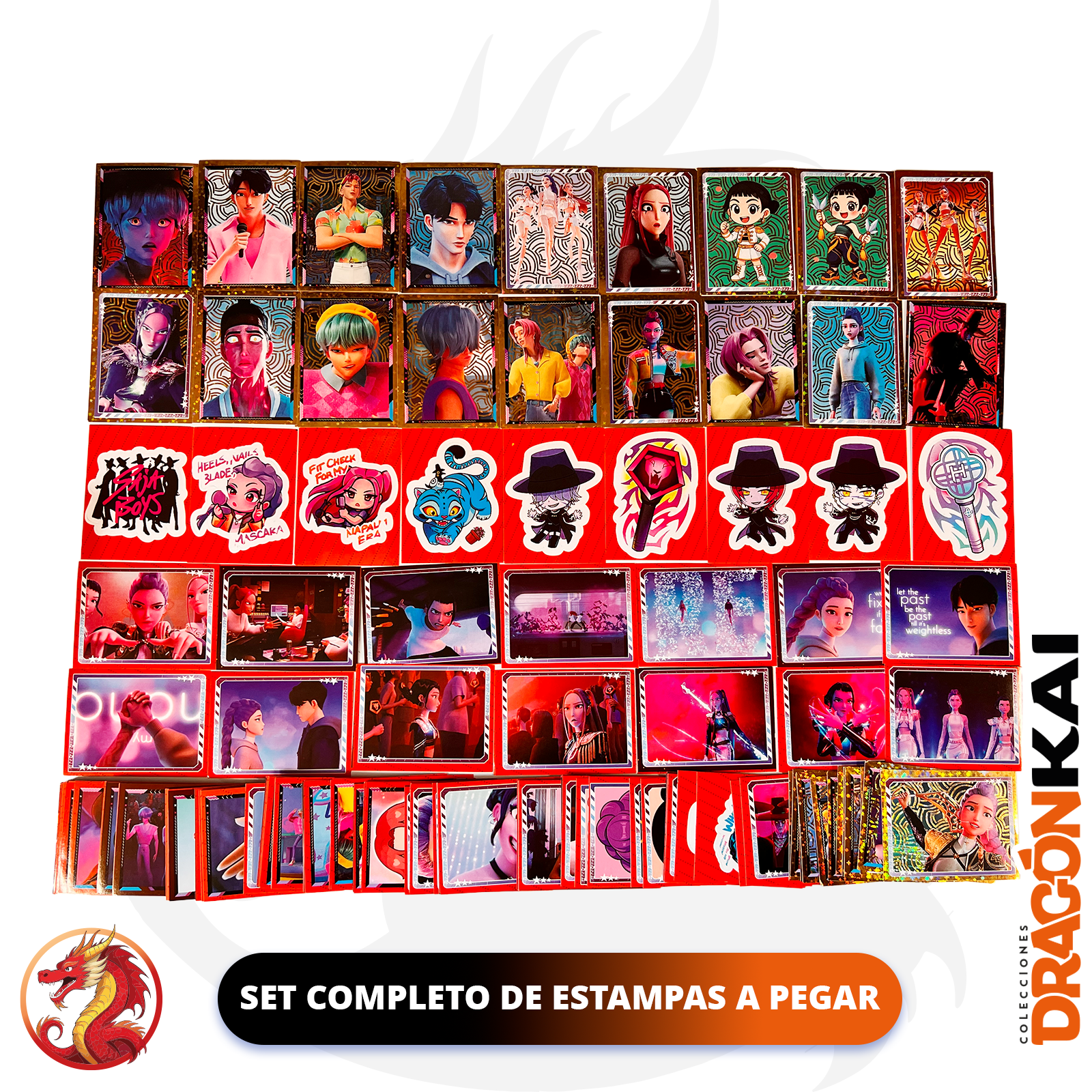 Incluye el set completo de estampitas para pegar, con figuras normales y especiales, destacando a los integrantes, sus looks, escenas clave de la película y artes exclusivos.
